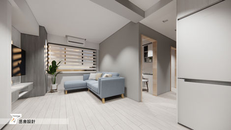 | 以暖色調的中性灰搭配淺灰色木頭色調,讓原本單面采光的空間更顯明亮,結合電視墻面的儲物櫃能滿足收納的需求。